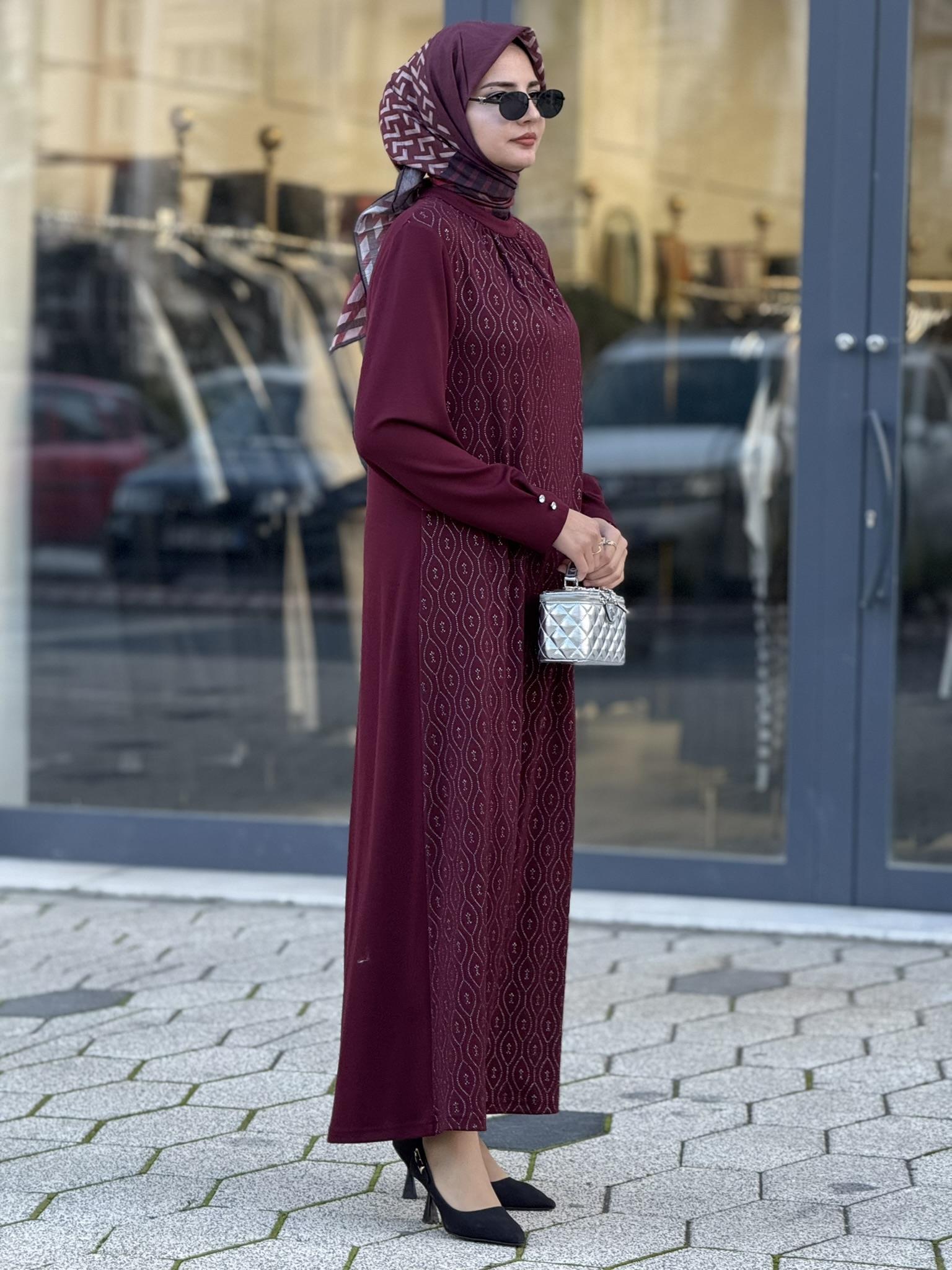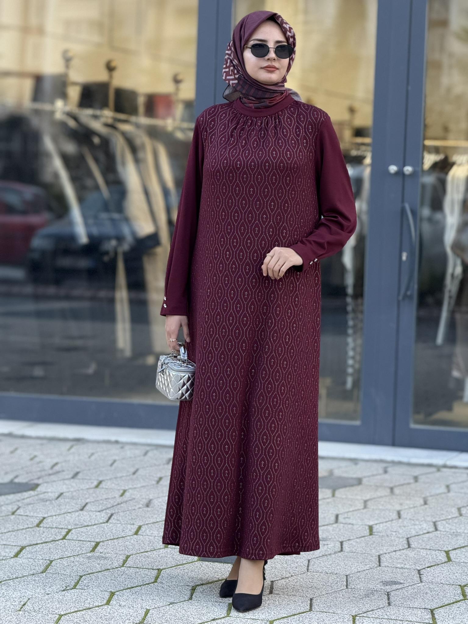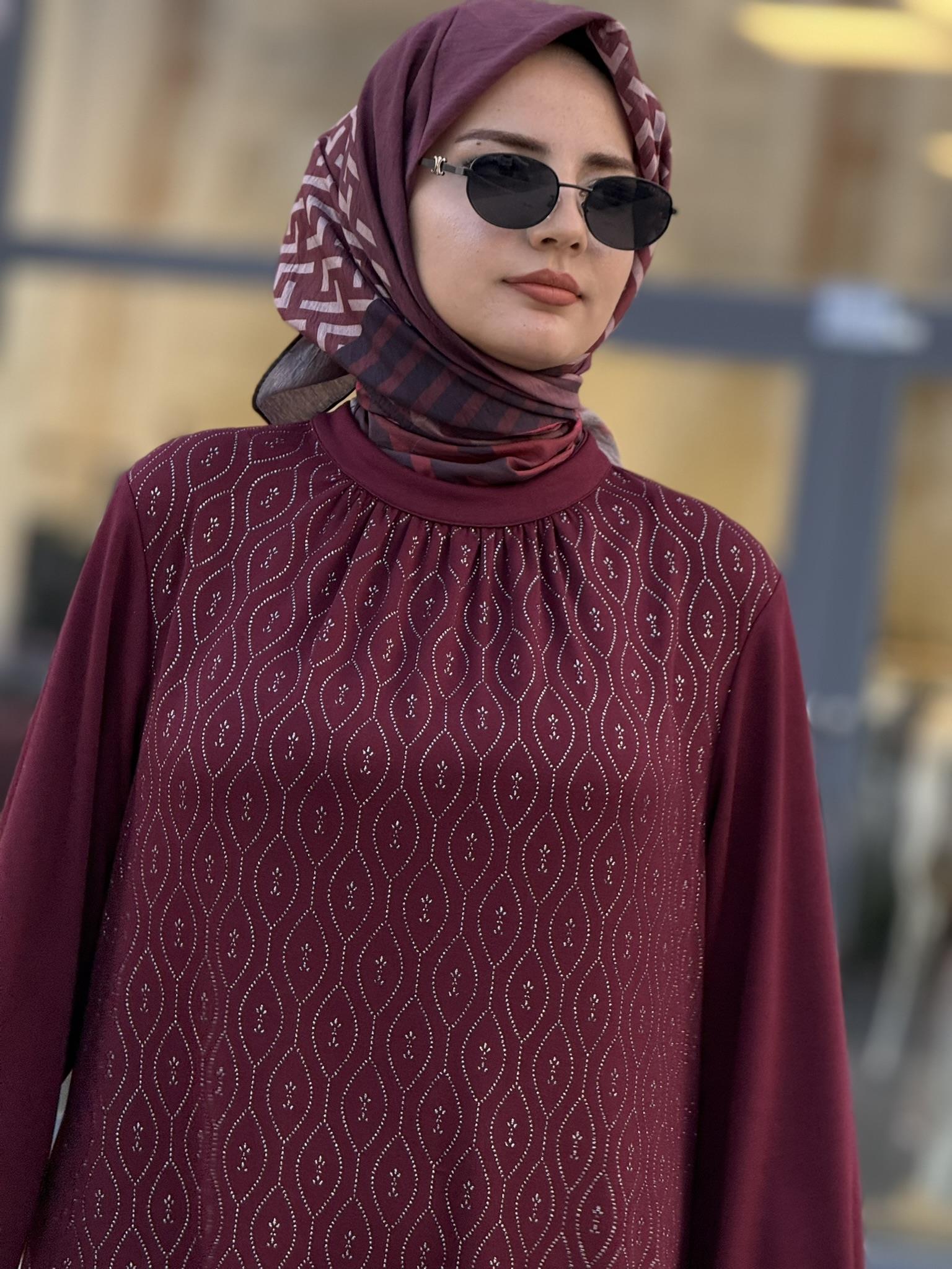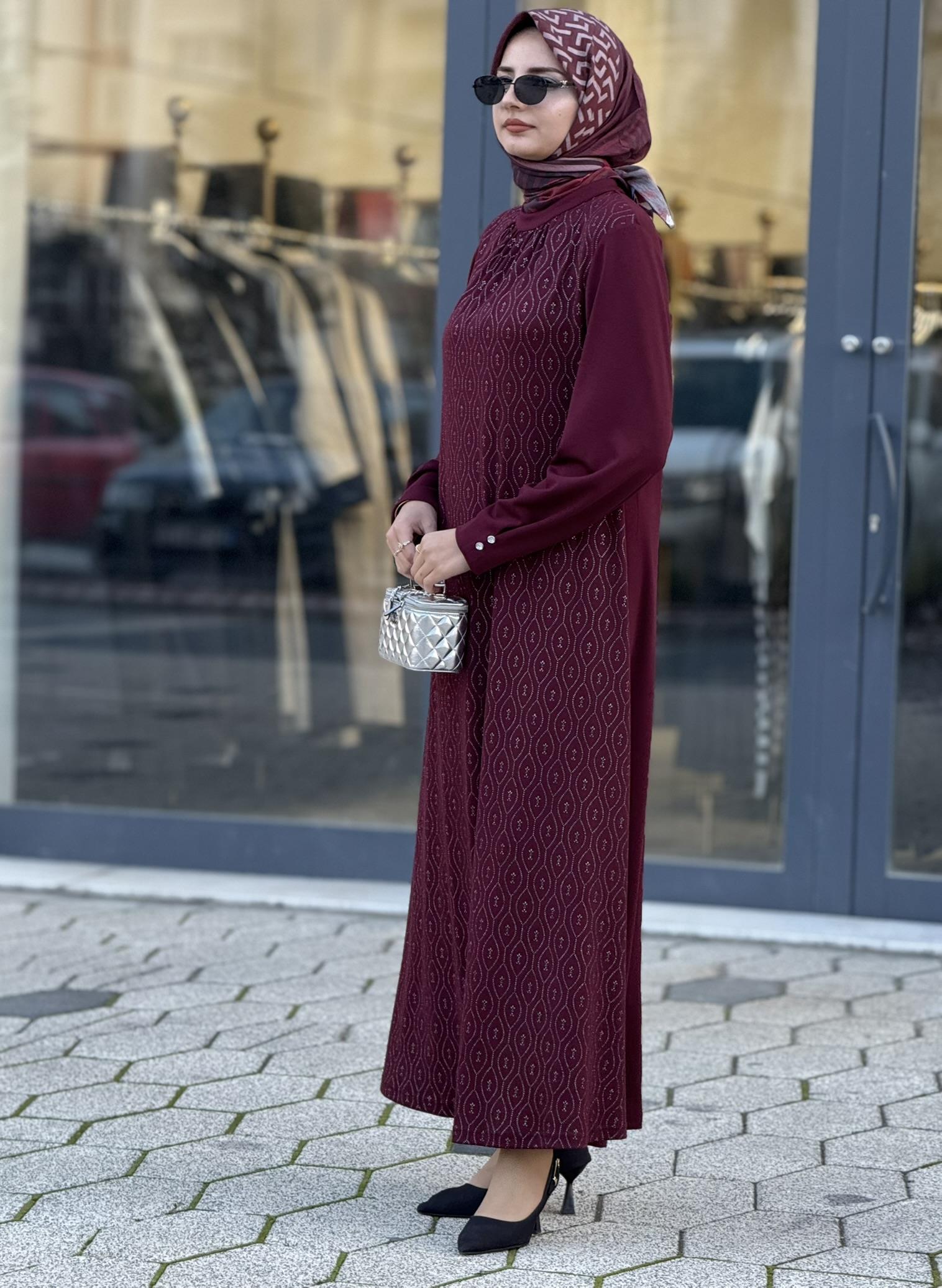 Yaka Büzgülü Simli Penye Büyük Beden Elbise Bordo OTW2200