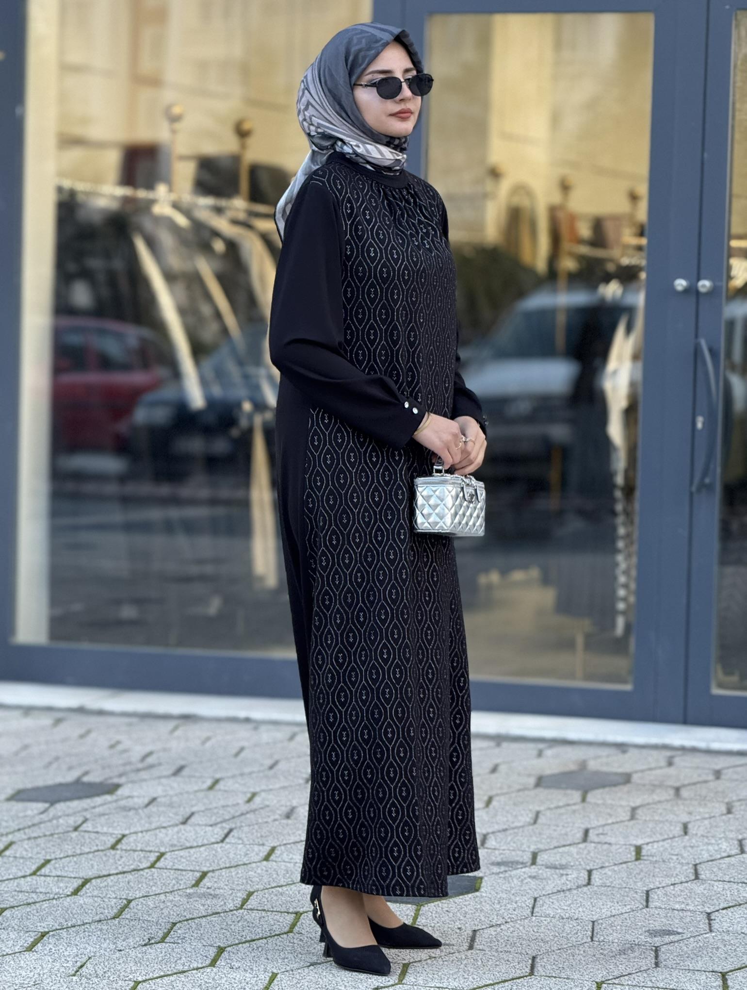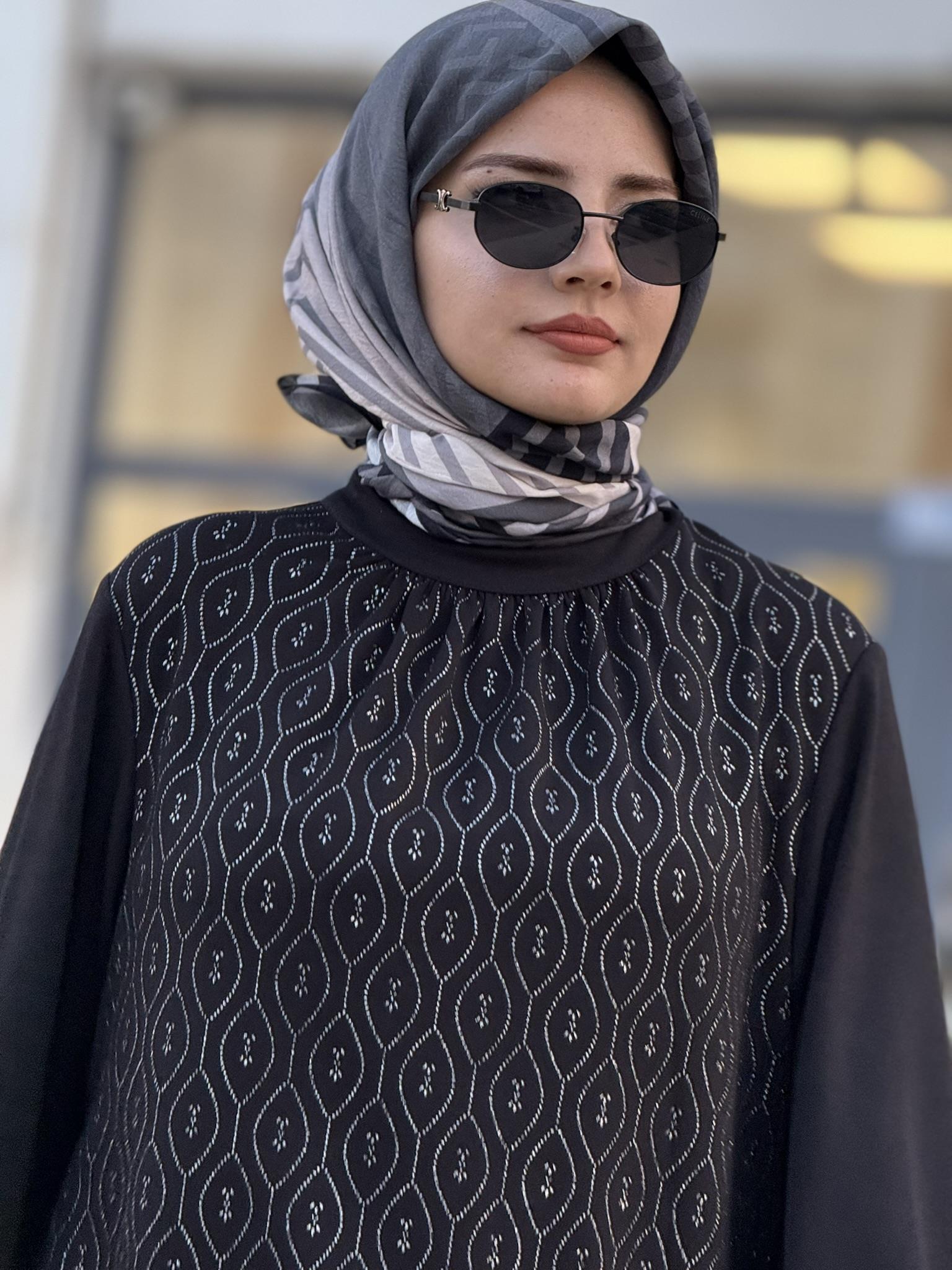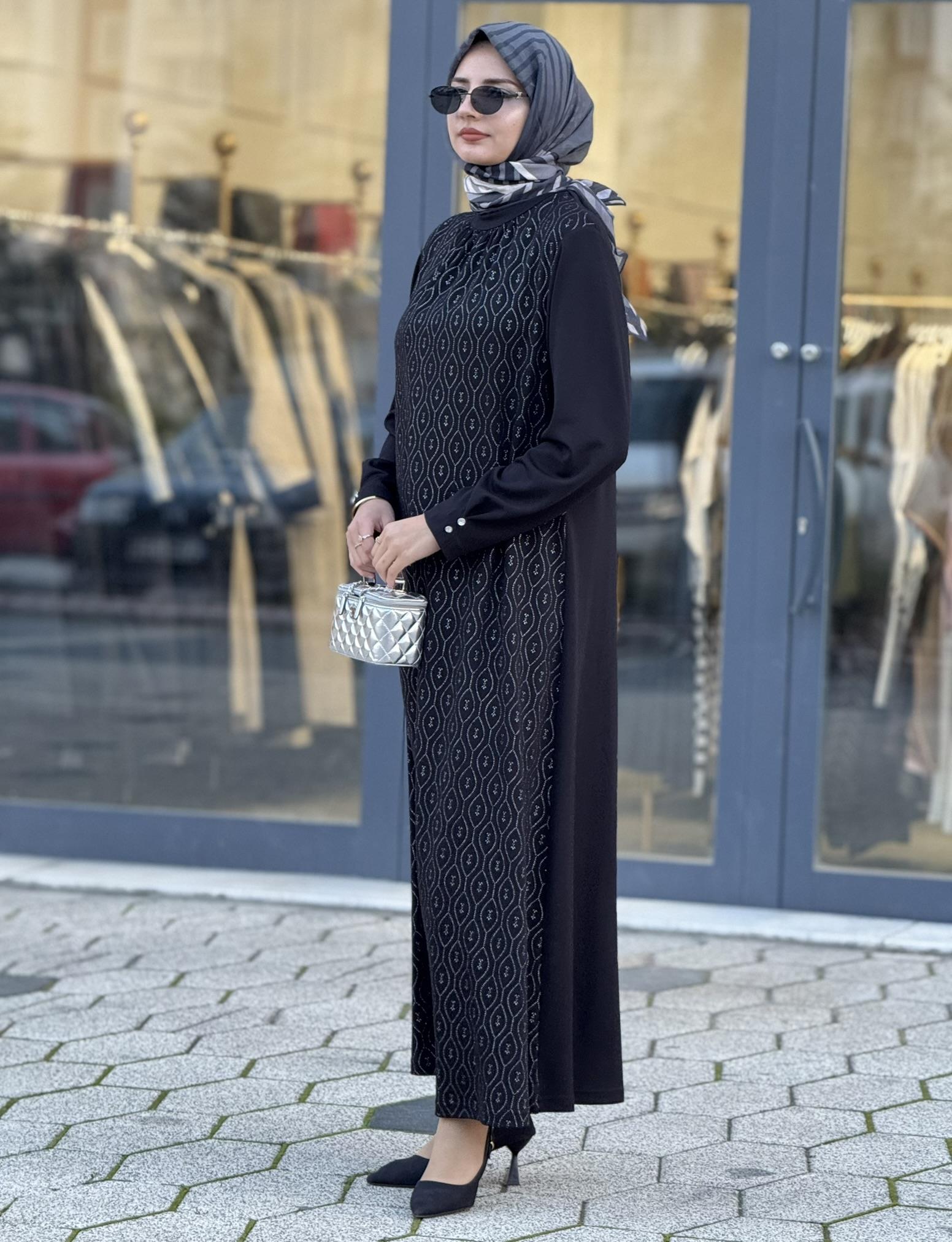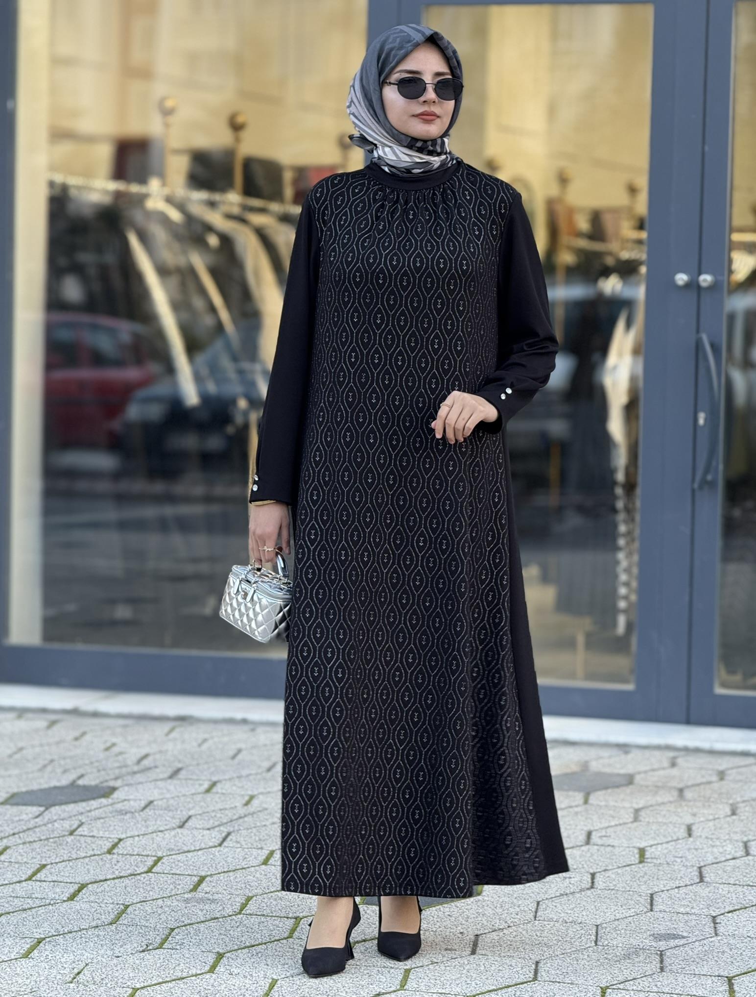 Yaka Büzgülü Simli Penye Büyük Beden Elbise Siyah OTW2200