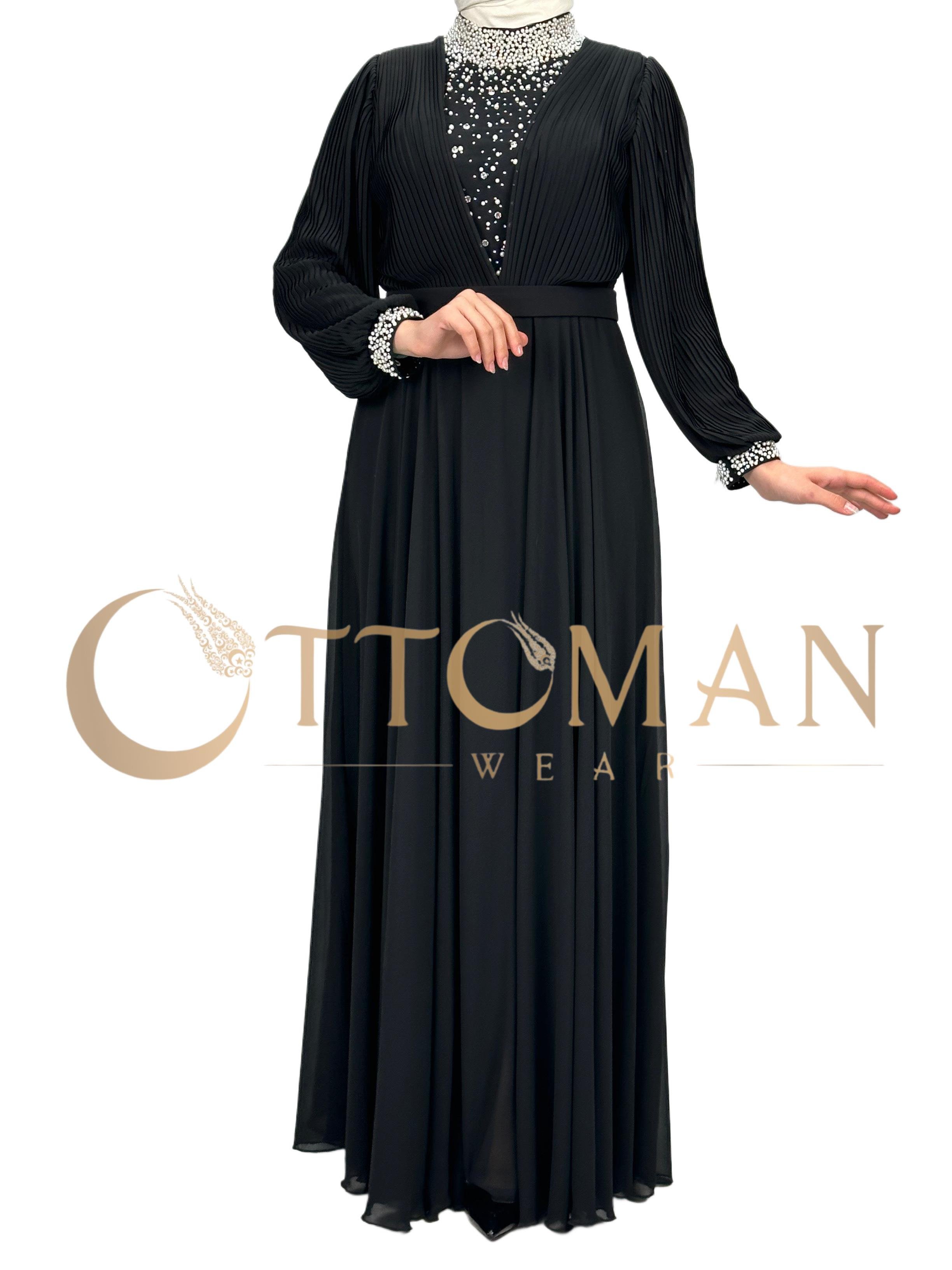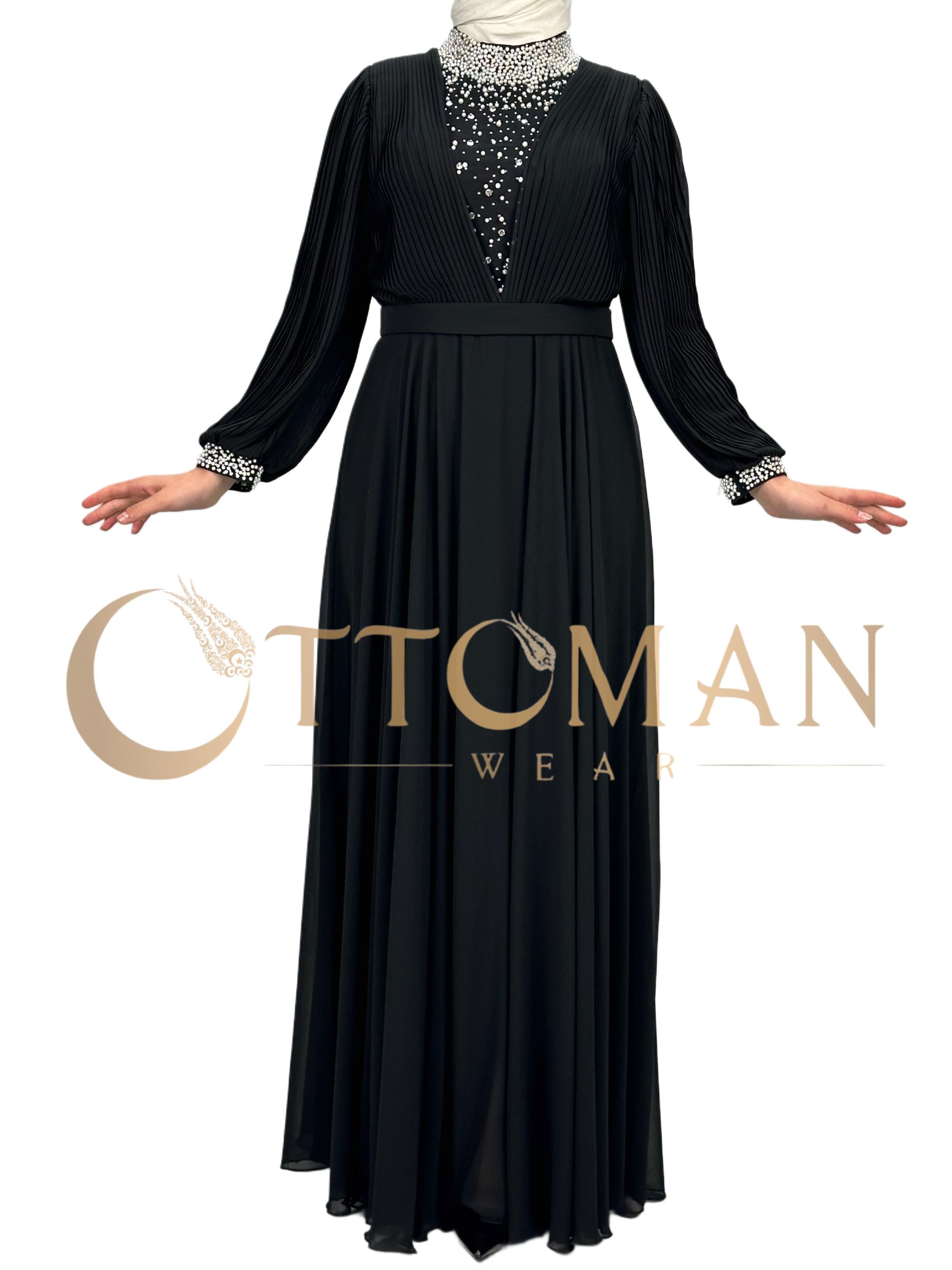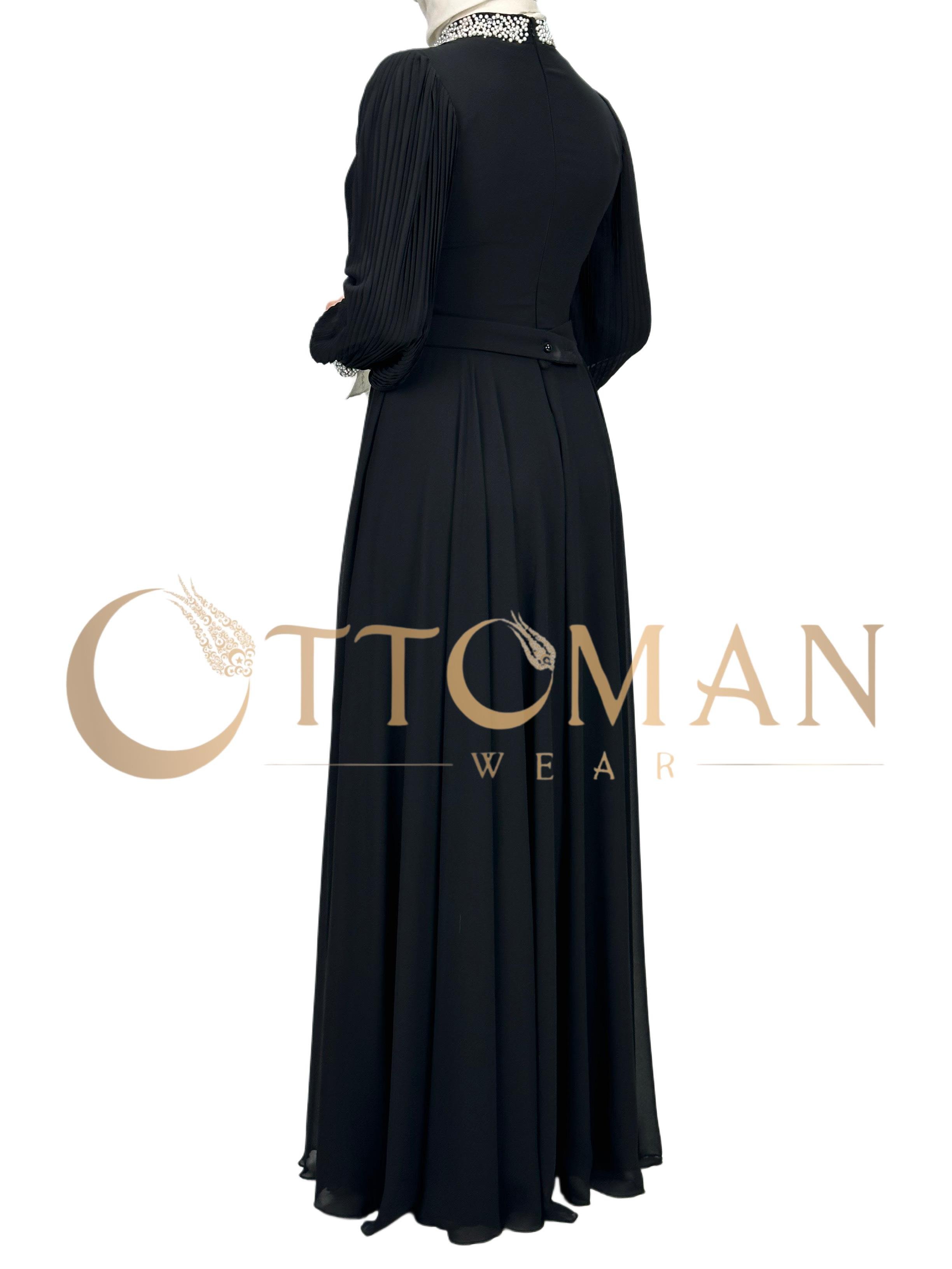 Yakası Taşlı Abiye Elbise Siyah OTW4620
